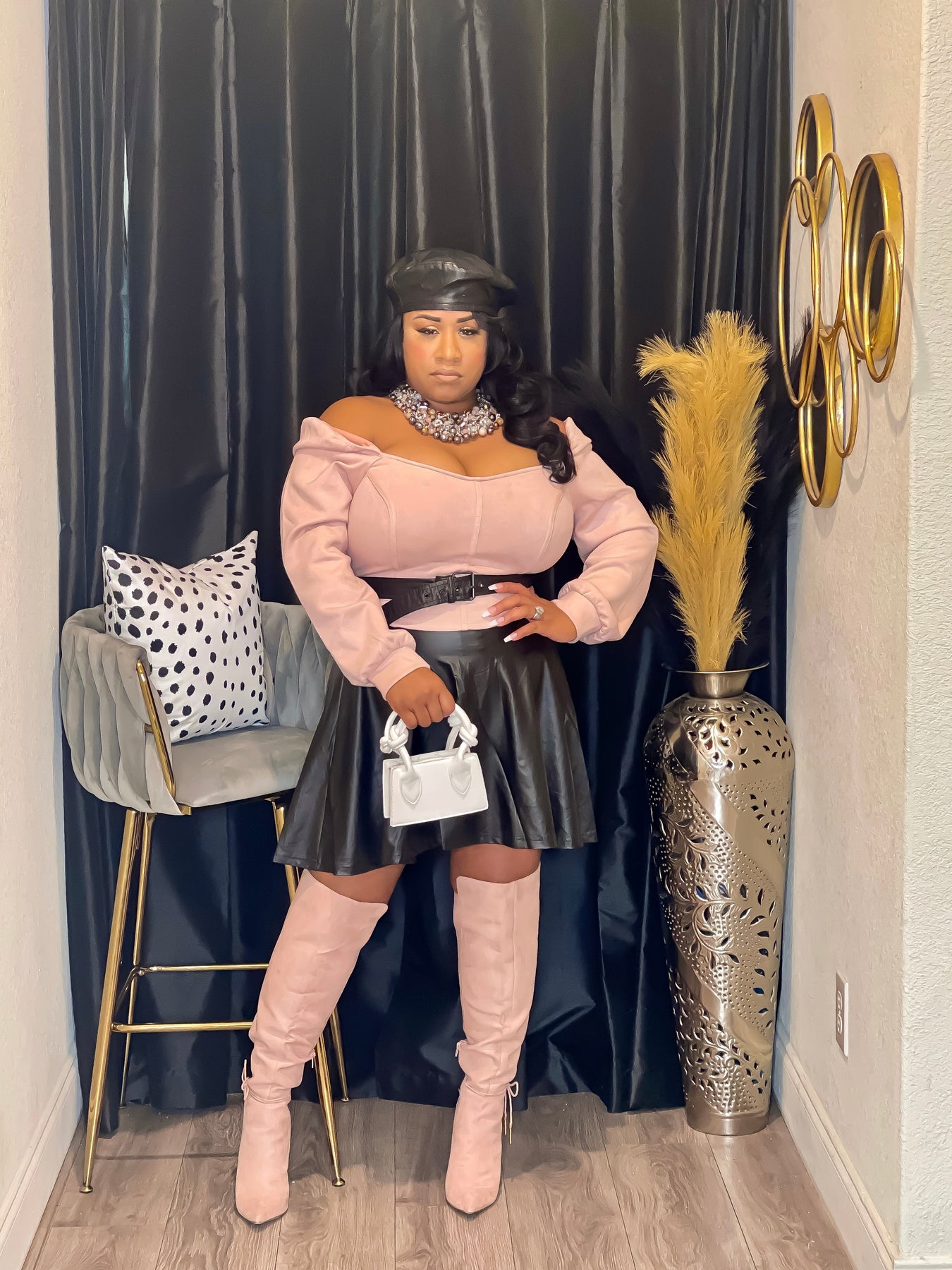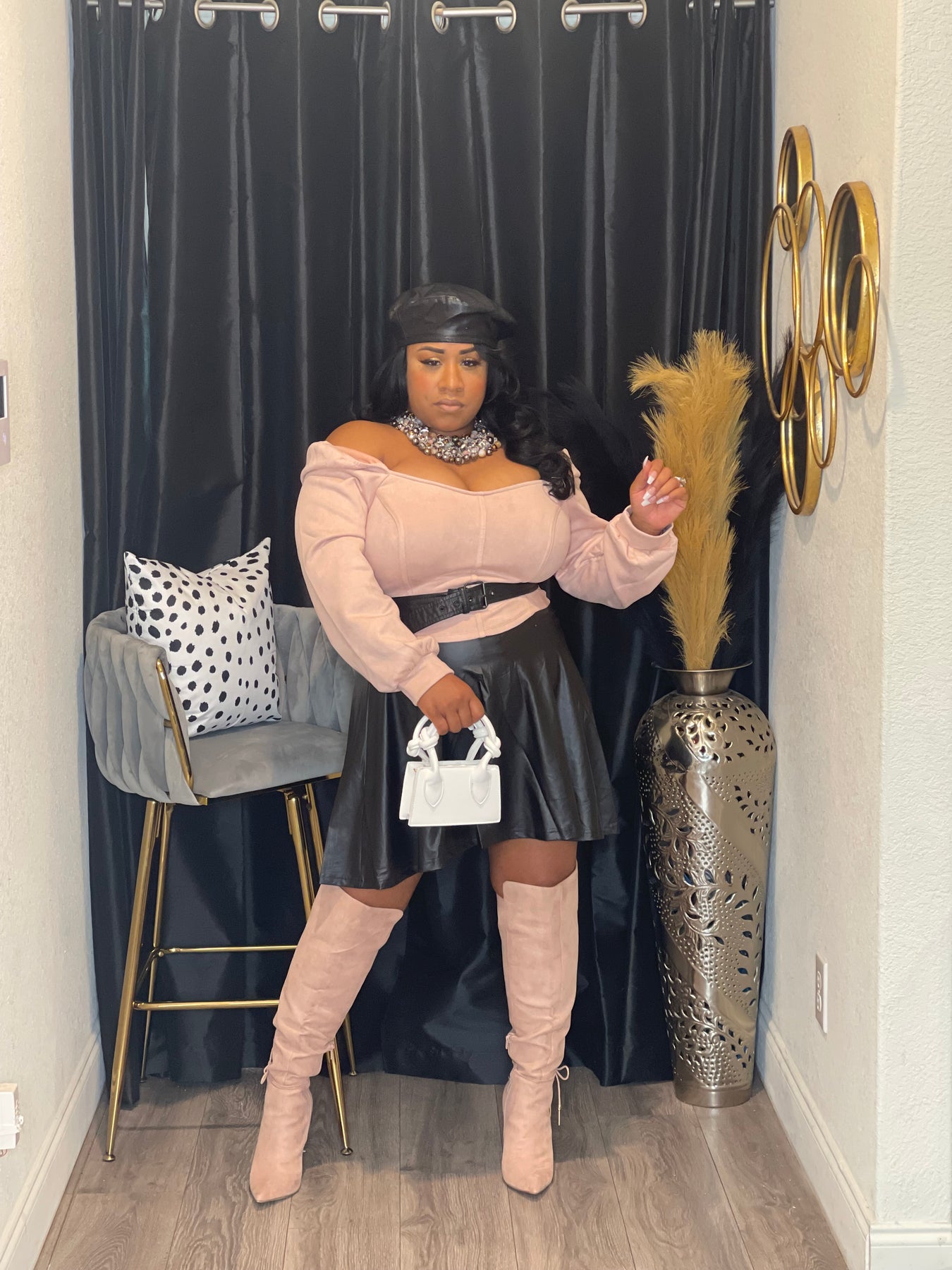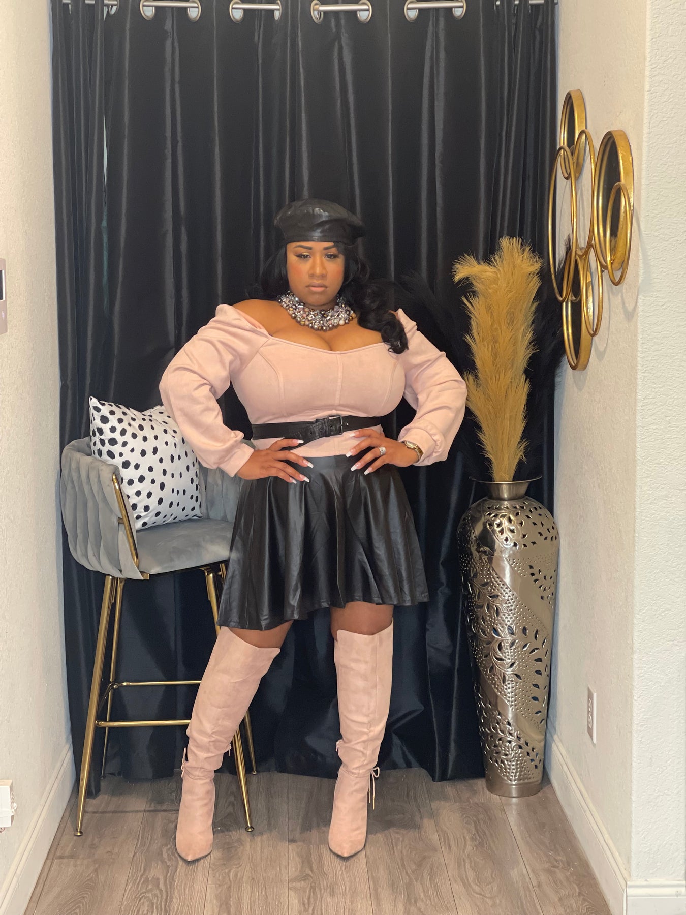A knit corset-like top in a faux suede fabric featuring solid color, princess seams, long cuffed sleeves with buttons, cropped, and a square-cut back design.