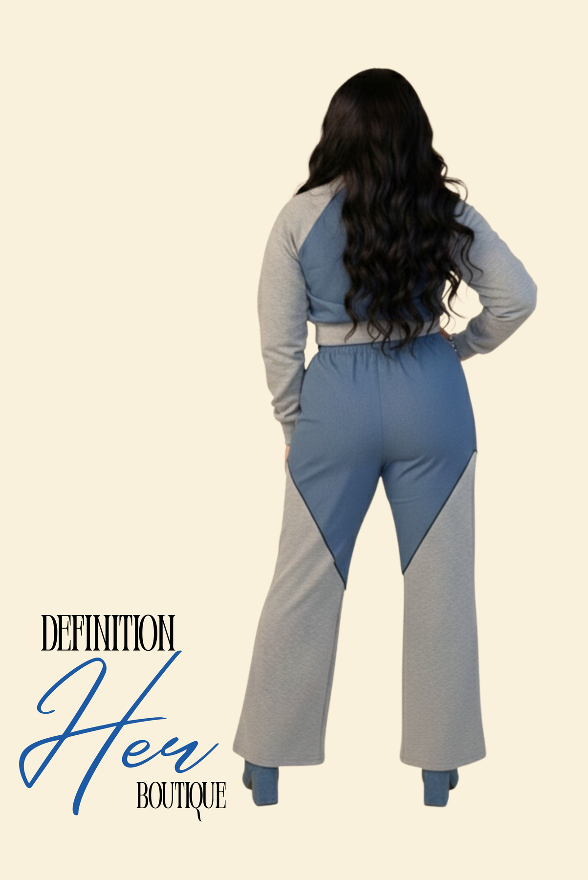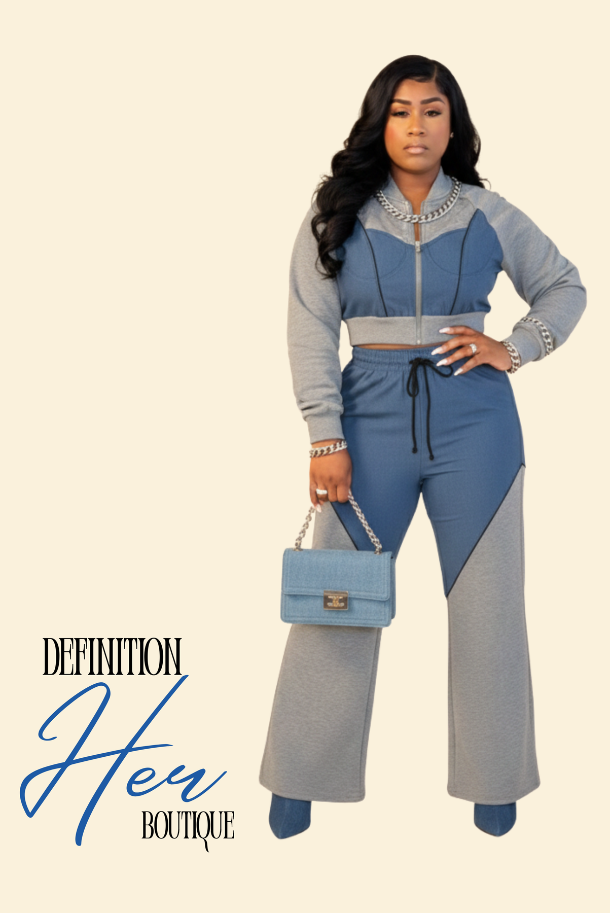 The cropped zip-up jacket features a denim-faced French terry contrast with organza trim piping detail along the front for that subtle, elevated touch. Paired with high-waisted drawstring pants featuring piping detail and an elastic waistband, this set gives structure while still allowing stretch and movement.